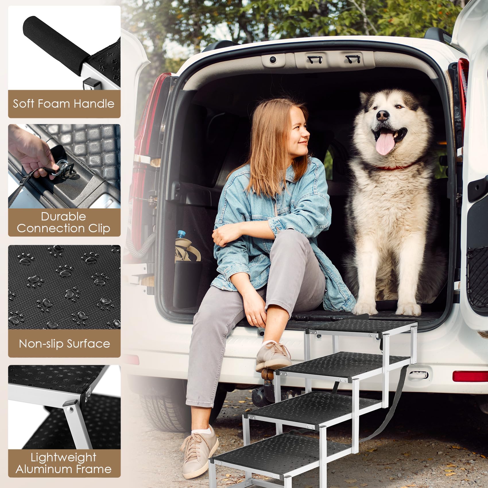- Foam Handle & Safety Tether Clip: The foam handle design can be attached to vehicles when your dog is climbing the step will not shake, top with a safety tether fasten on the tailgate latch to prevent the dog ramp from disengaging or falling over.