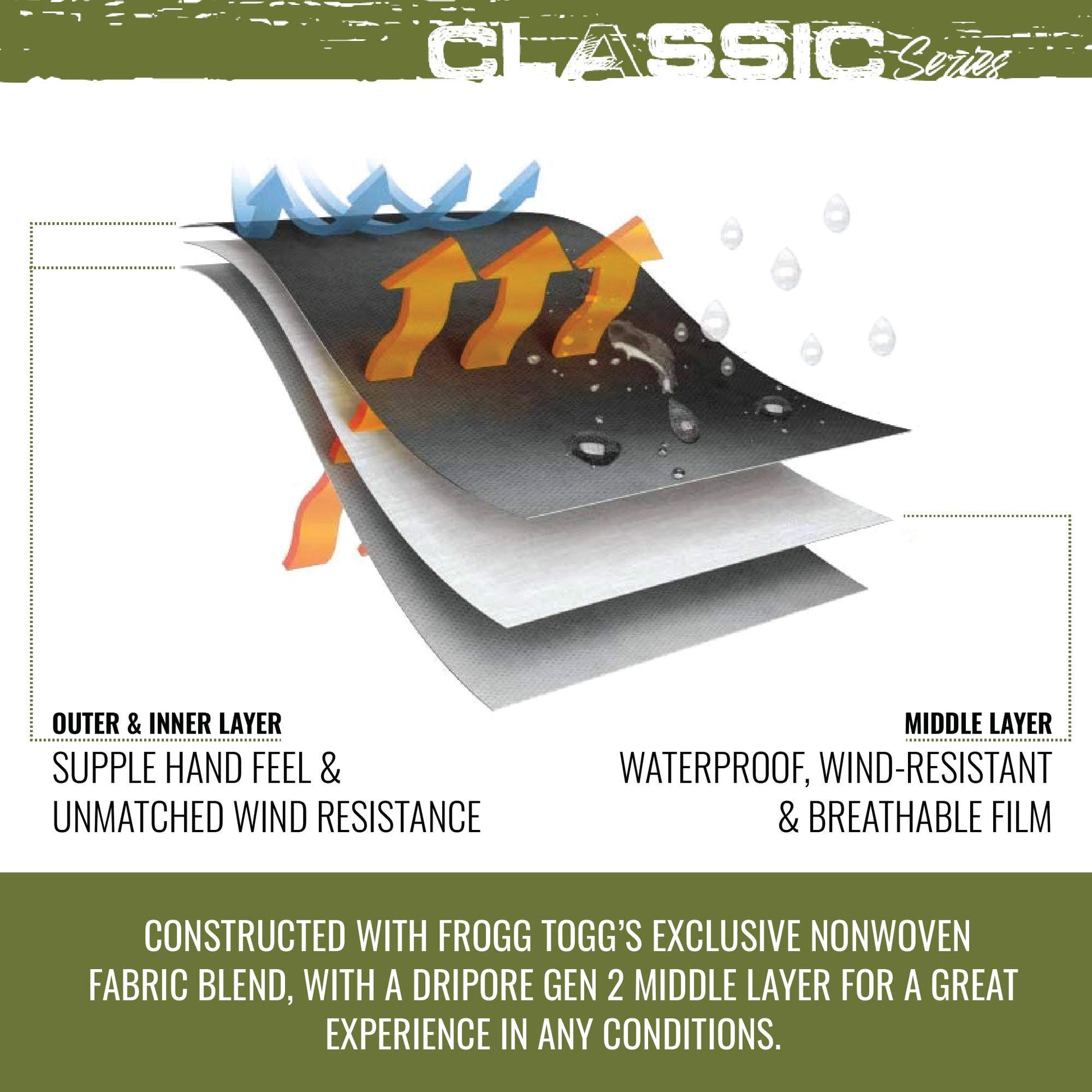 - WATERPROOF – Fully Seam Taped Jacket and Pant Rain Suit designed with FROGG TOGG’S Exclusive Polypropylene nonwoven fabric blend, with a DRIPORE GEN 2 middle layer for Waterproof, Wind-Resistant and breathability all day comfort