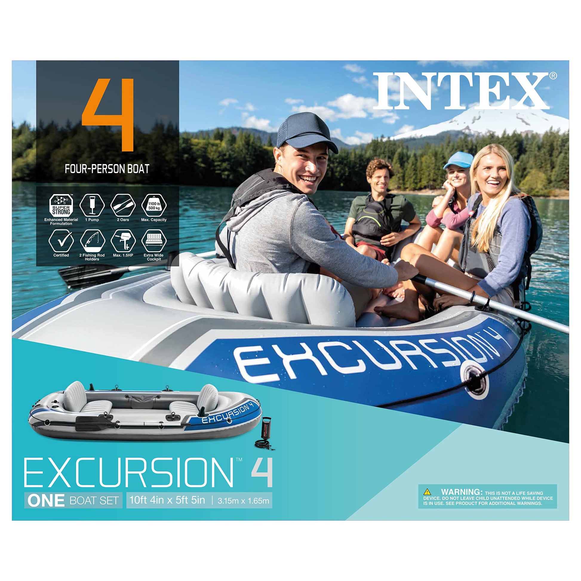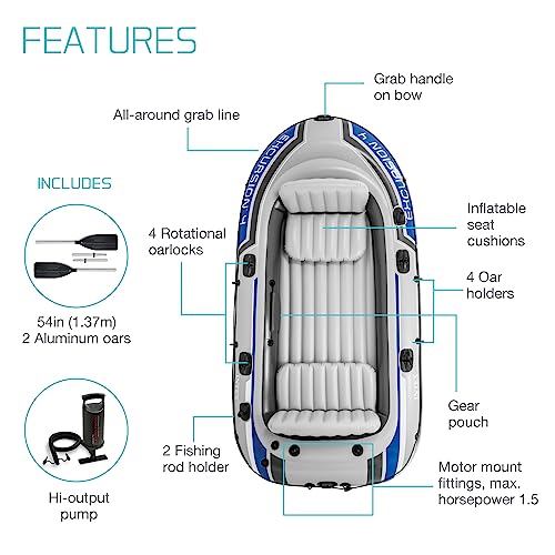INTEX 68324EP Excursion 4 Inflatable Boat Set: Includes Deluxe 54in Boat Oars and High-Output Pump – Adjustable Seats with Backrest – Fishing Rod Holders – 4-Person – 1100lb Weight Capacity