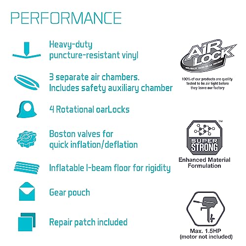 - ADVENTURE ACCESSORIES – Includes two 54 inch boat oars, two detachable fishing rod holders, gear pouch, carry bag, high-output pump and a repair patch