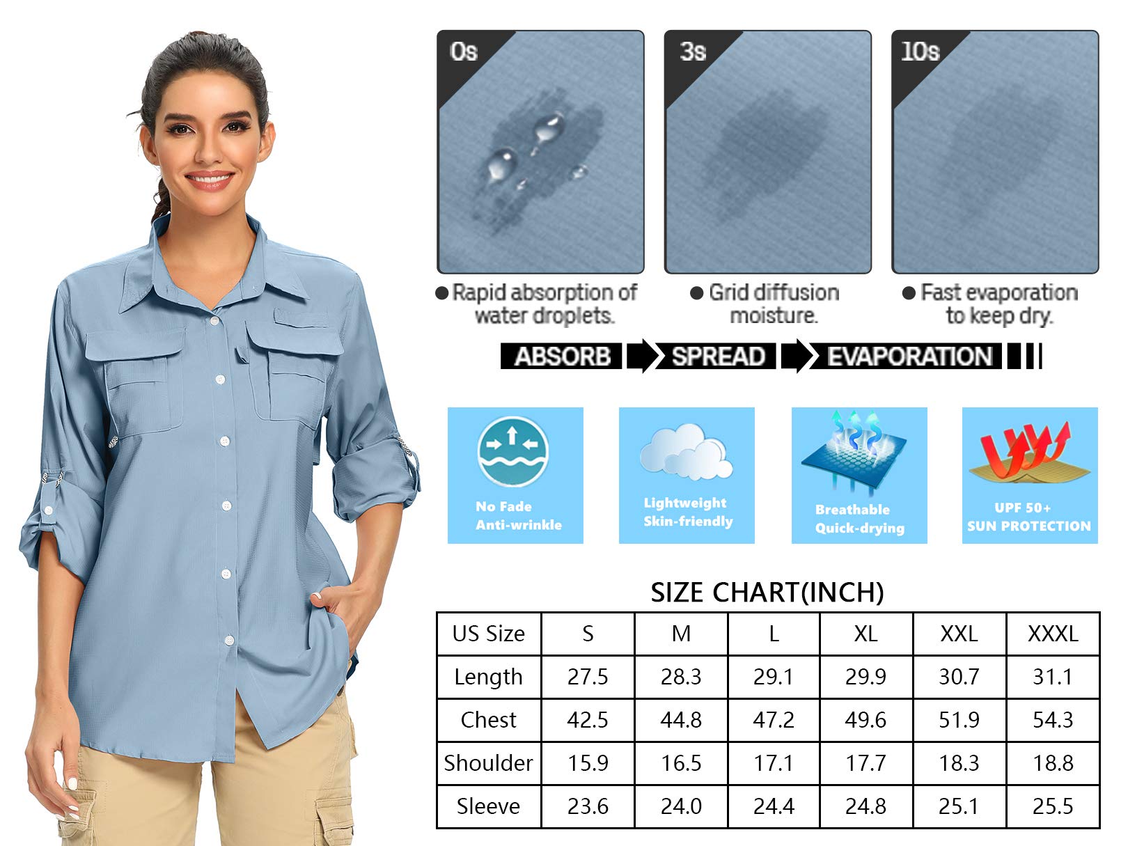 - Women's long sleeve SPF shirts using Omni-Shade UPF 50 fabric for maximum protection against the sun, reduces your exposure to harmful UVA/UVB radiation.