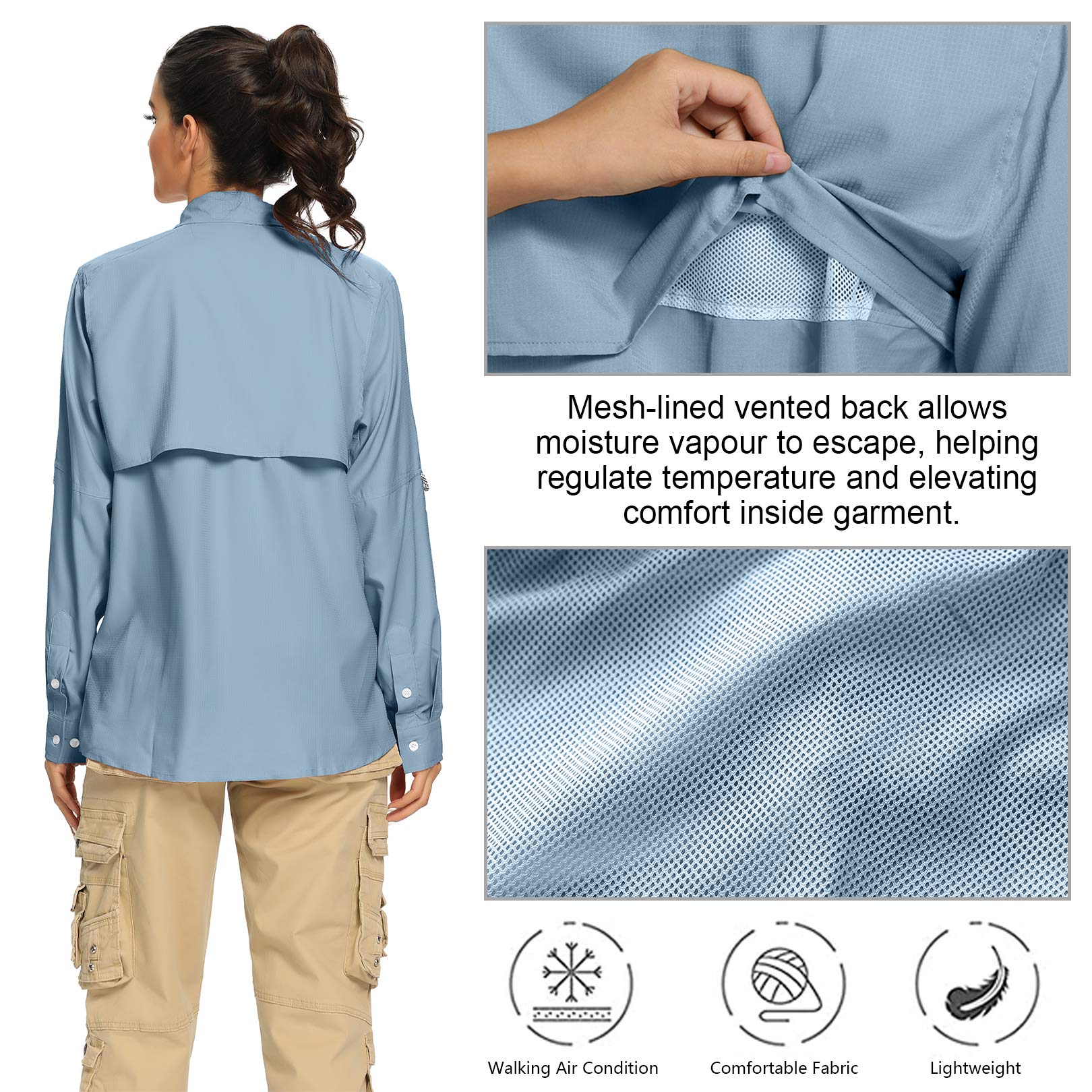 - Women’s lightweight safari shirts features a mesh-lined vented back for breathability and comfort. Roll-up sleeves to convert long sleeves to short sleeves for hot days.