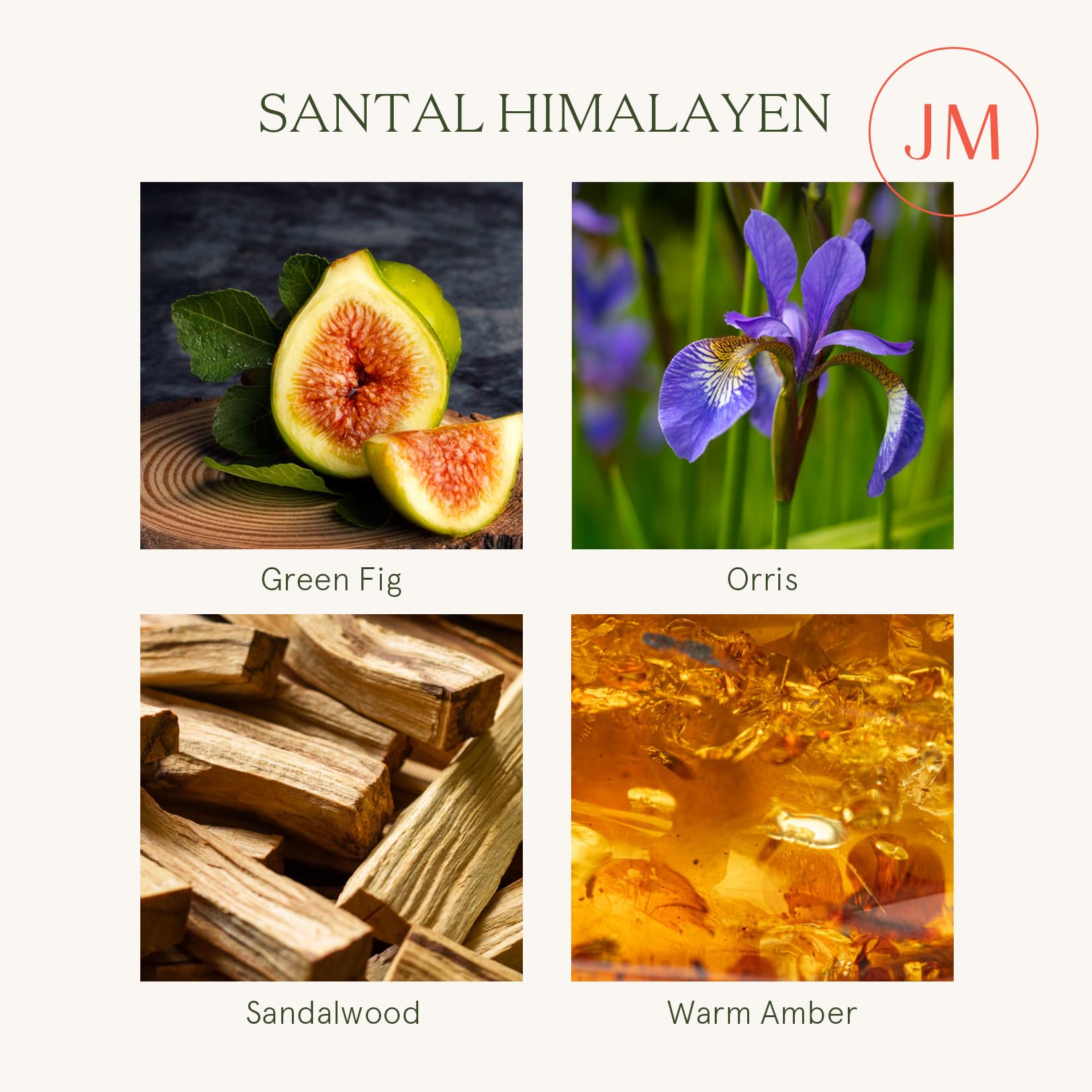 - SANDALWOOD SYMPHONY - Blend of crisp apple and green fig harmoniously entwined with warm clove, leading to a heart of creamy sandalwood, jasmine, andvelvety orris, all resting on a rich base of sandalwood, golden amber, and musk.