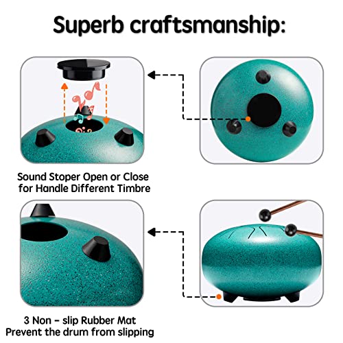 - π Accessories Upgrade: 6 inch steel drum, drum mallets, drum bag, finger plectrums, spare note stickers, sheet music, mallets stand. Steel drum are a total of 8 tones, which have a wider range of sound and can play more music. You can play steel drum with the included drum mallets or with you hands, and the included note enable beginners to learn and play it more easily. Steel drum comes with a carry-on bag for easy carryinag