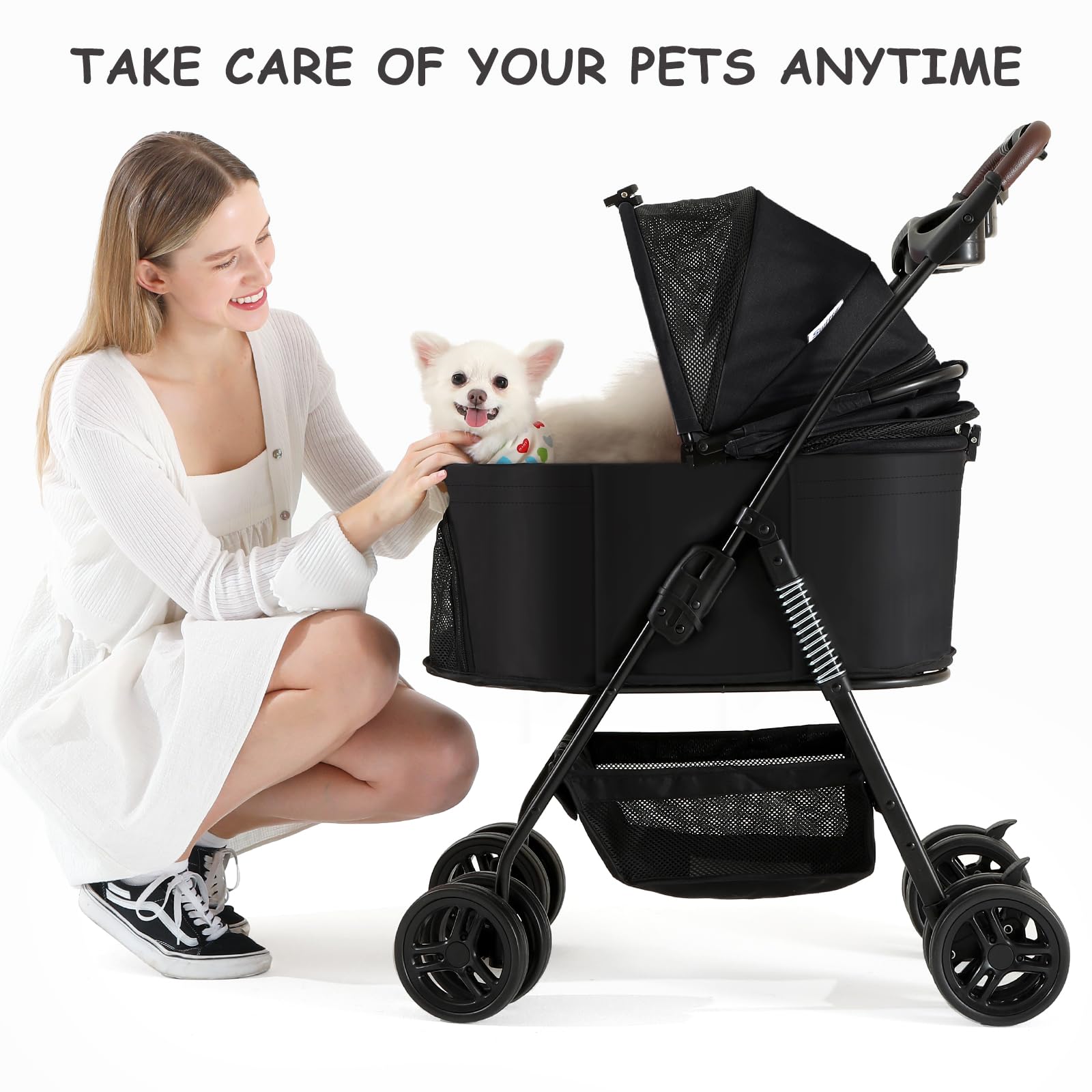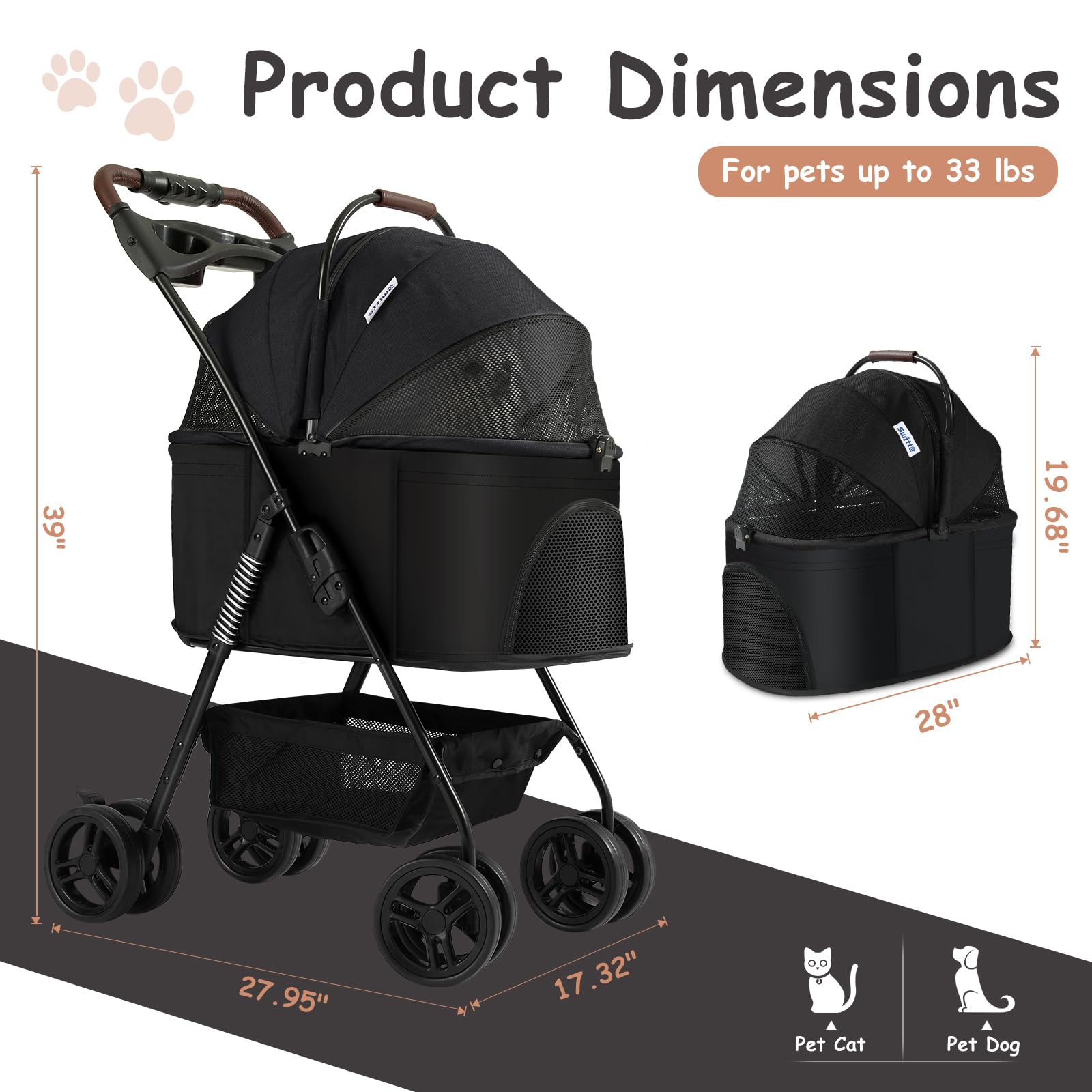 - 3 in 1 Multi-functionality & Spacious Pet Space: SWITTE foldable dog stroller is the ideal companion for your travels! It serves as a pet stroller, a detachable travel carrier, and a car seat in one. With two safety leashes in the basket to prevent dogs and cats from accidentally jumping out. This cat stroller has an Inner size of 22.8''L/11.8'W/9.25''H and can hold pets up to 33 pounds, making it perfect for small to medium-sized pets