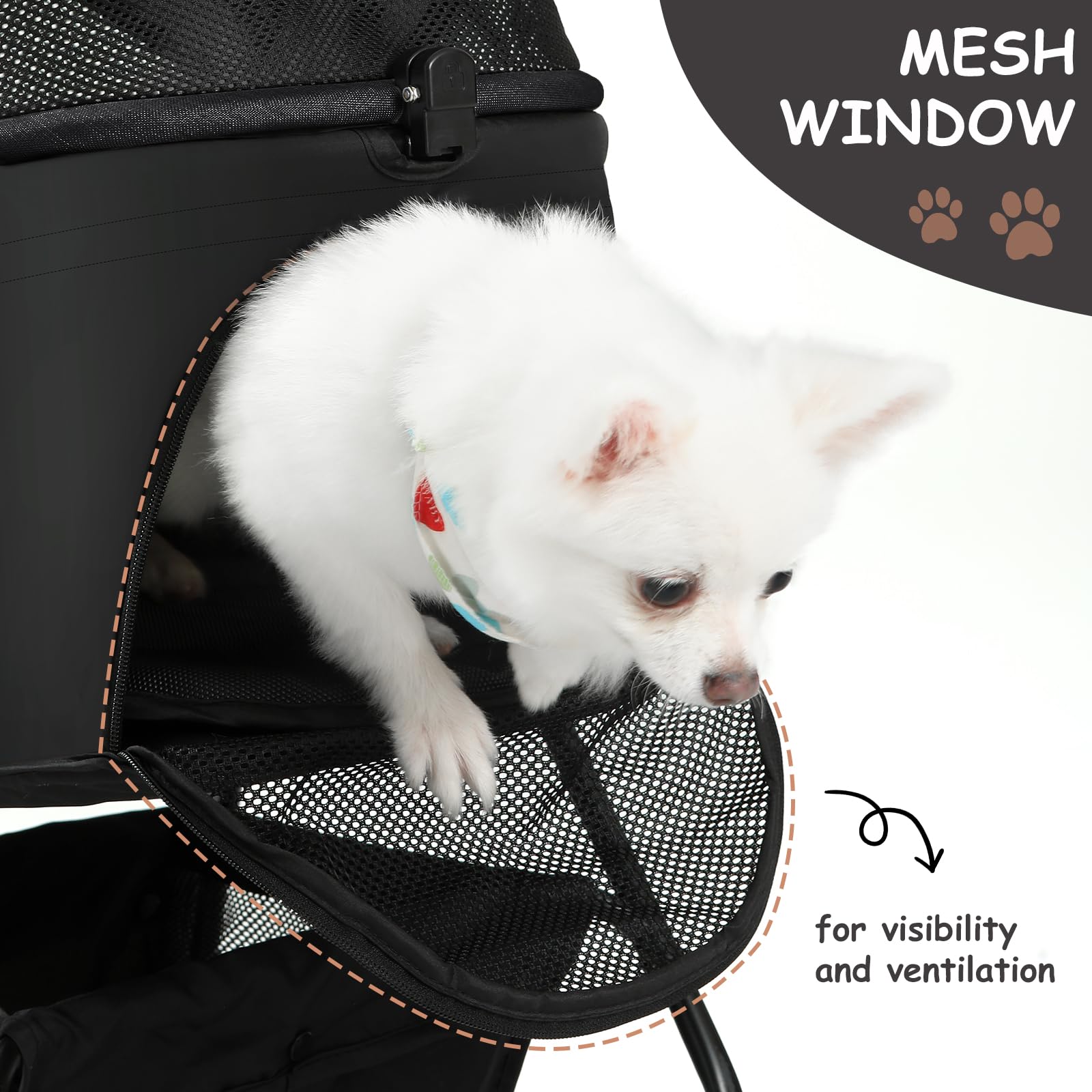 - 180˚ Adjustable Canopy & Large Storage Space: The canopy of the dog jogging strollers can be fully opened and reversed for a diverse view. 5 mesh windows of our pet stroller for cats are designed for good air ventilation and provide a great view for your pet. The sides of the basket are equipped with shade cloths to create a more comforting environment for anxious pets. In addition, cup holders and storage baskets can store water bottles, cell phones, dog toys and more