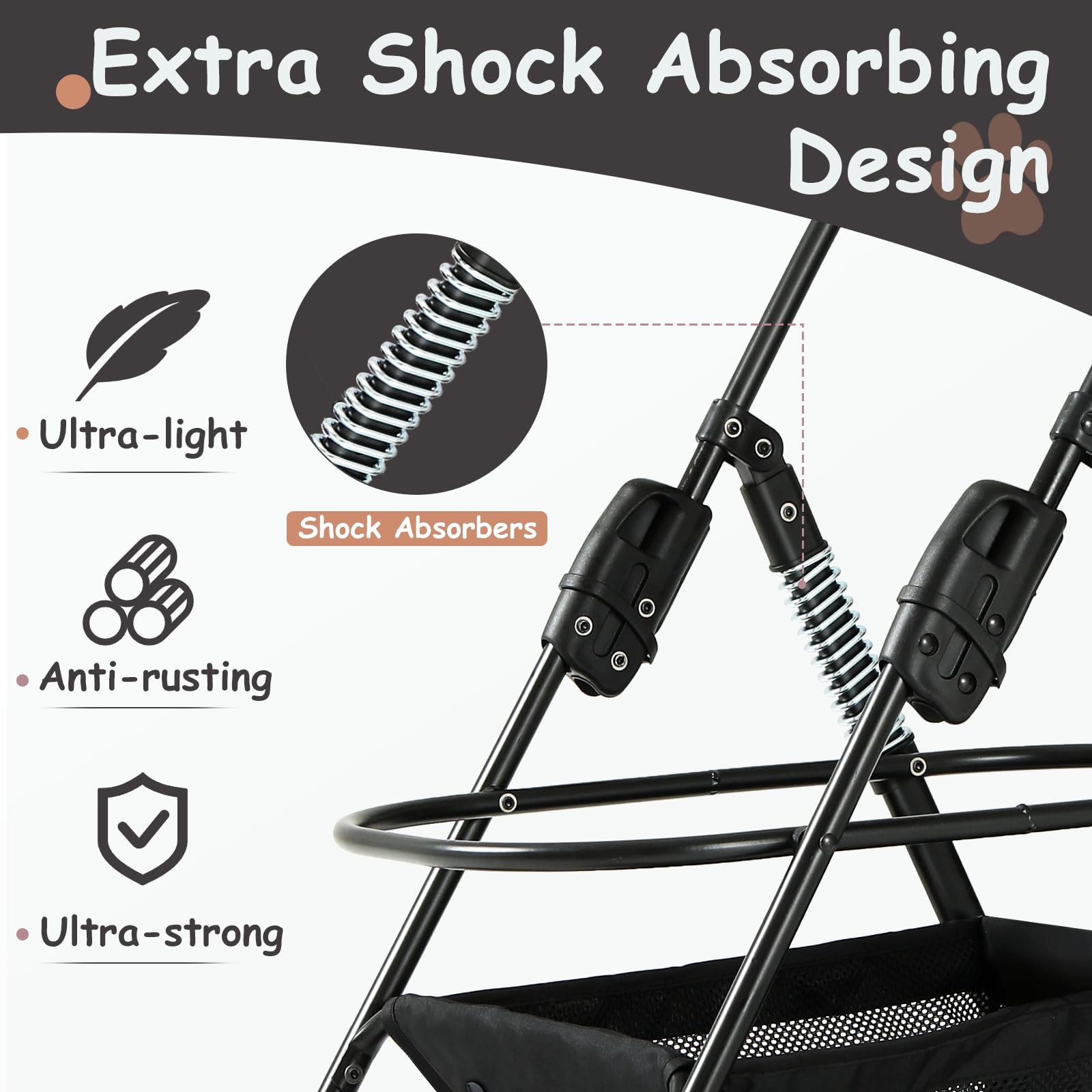 - Driving Safety & Shock Absorbers: With two 360° swivel front wheels, this dog stroller for small dogs offers easy maneuverability and smoother transport even on the roughest terrain. Two rear wheels with brakes for easy stopping ensure your dog's safety during the ride! Unexpectedly, the shock-absorbing design on both sides of the SWITTE puppy stroller greatly enhances comfort, making it ideal for injured, sick, and frightened pets