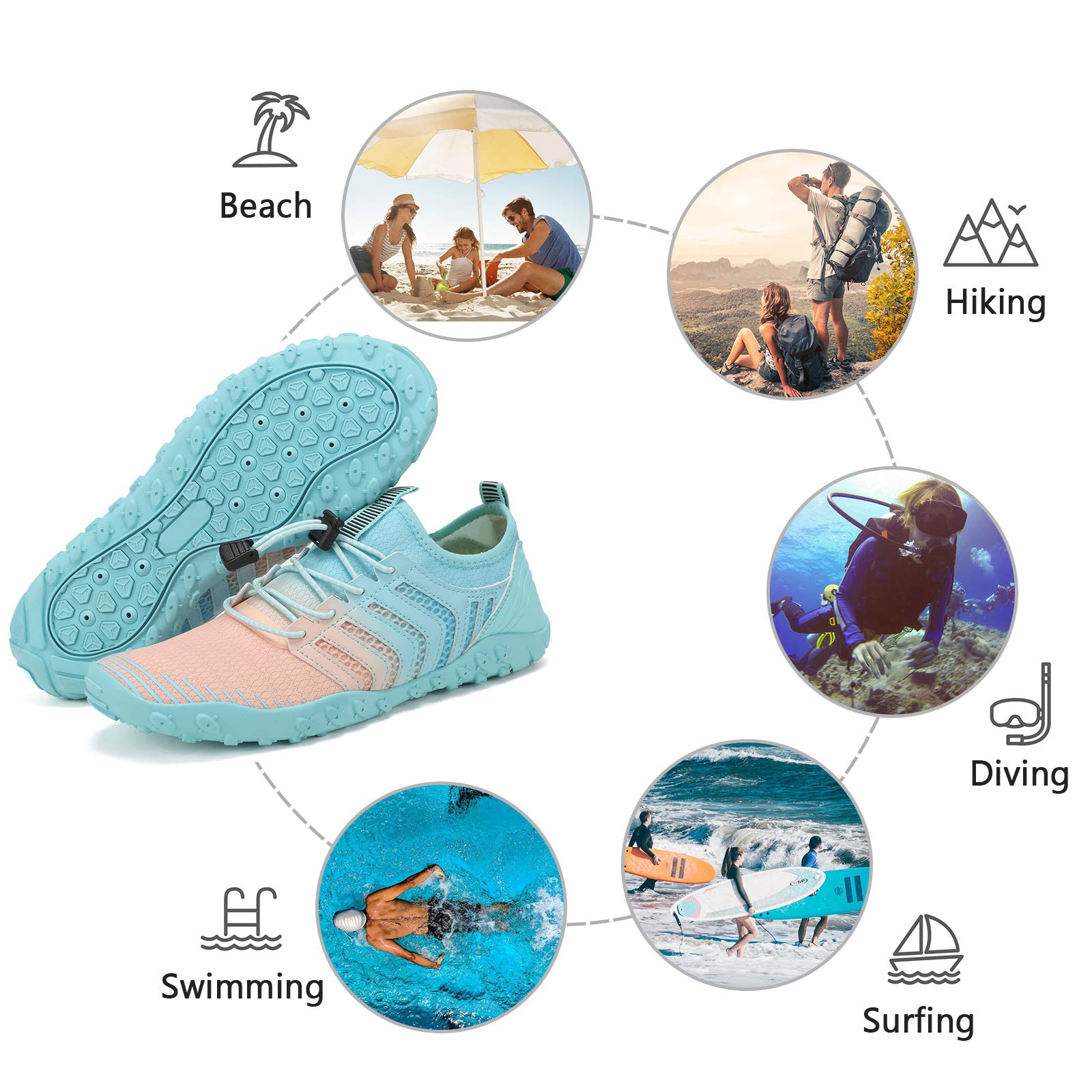 - GOOD ELASTICITY AND STARDARD FOOT MODELS: Breathable and smooth fabrics with fine stretch on uppers, flexible and comfortable. Smooth designed neck prevents chafing when wearing our water shoes.With an ergonomically molded and standard foot models, Perfect wrap your feet!