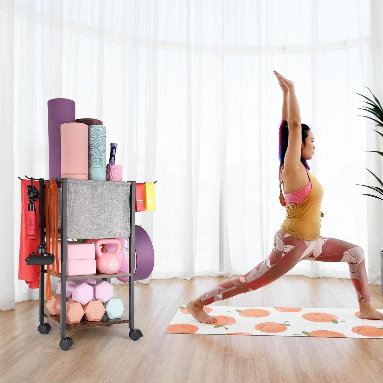 - 【Store Various Exercise Equipment】The fitness equipment storage rack combines yoga storage basket, home gym organizer shelf stand and resistance bands hanger. It can store yoga mats, foam rollers, yoga bolsters, small exercise balls, yoga blocks, dumbbells, kettlebells, resistance bands, yoga straps, pilates bars, jump ropes, yoga wheel, weighted hula hoops, water bottles, yoga towels and more gym equipment.