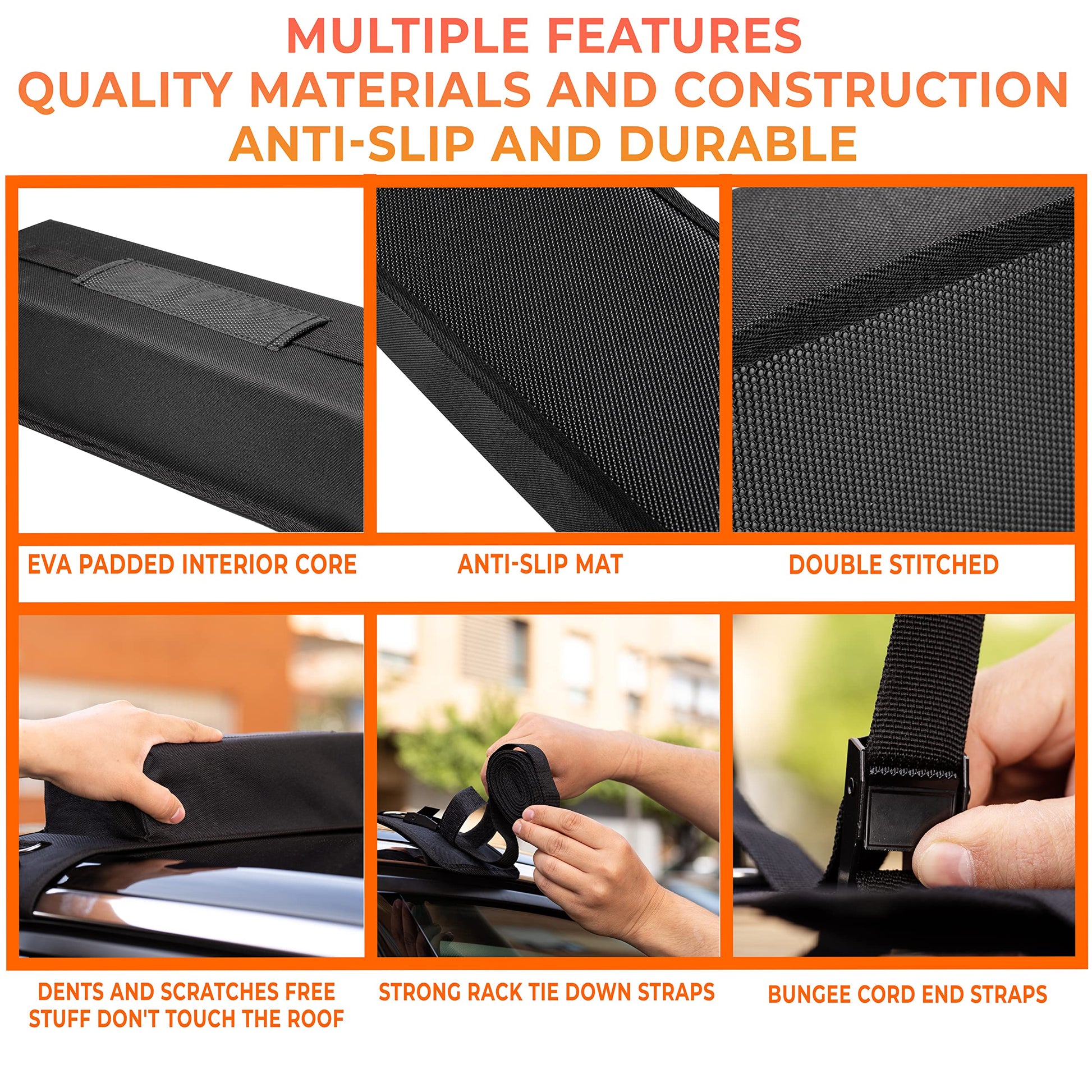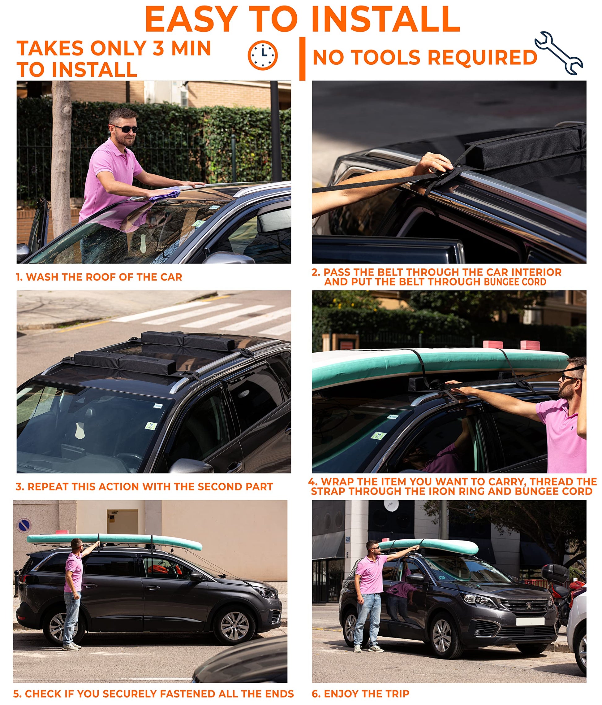 - Quick & Easy Install- Zone Tech Car Soft Roof Rack pads are Easy to install. No tools are required, this soft rack set comes with all the attachments and straps necessary to attach the pads to your car’s roof and hold the load in place. Thick 16ft polypropylene tie-down straps with heavy-duty corrosion-free cam buckle. The protective sleeve encases the cam buckle, protecting your car and boards from scratches.